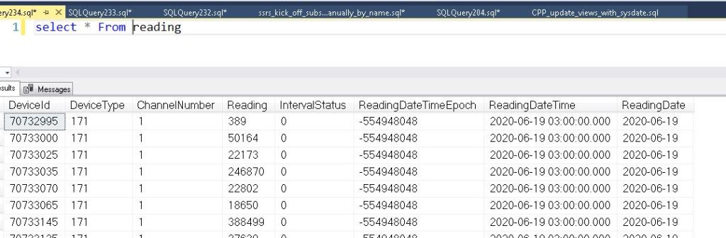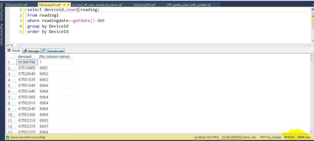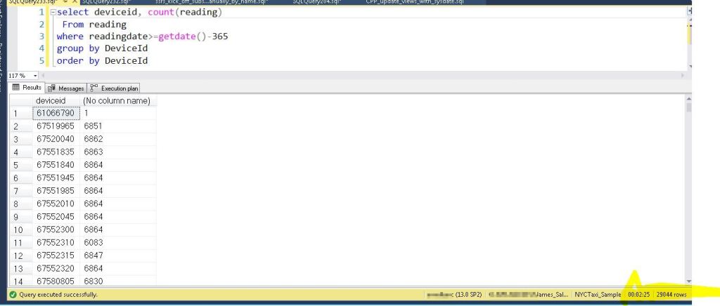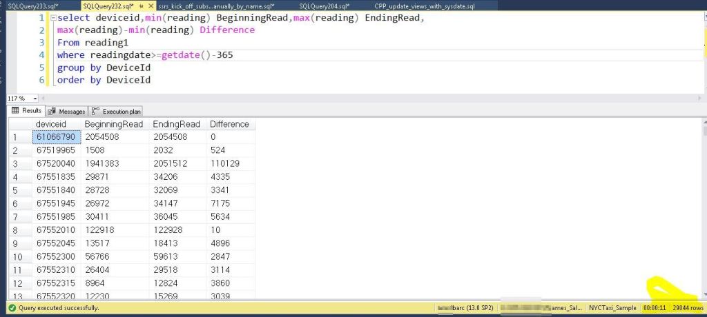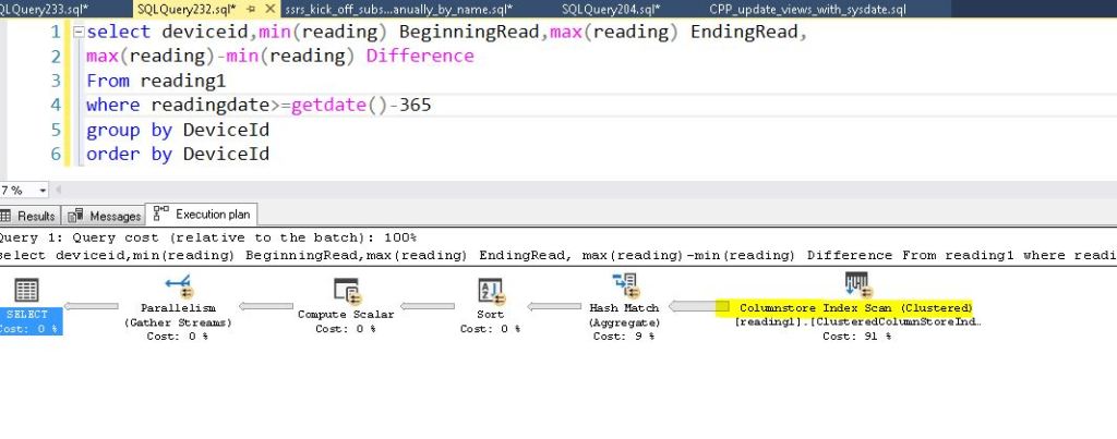 Here is a common query that gets the beginning read and most recent read for a device over the last year. Using the table without the column store index, it took just over 6 minutes.