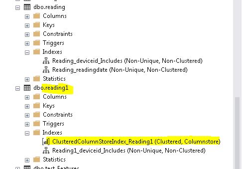 First here is my table structure. It is a table that shows hourly reads for different devices. There is a table called READING which has non-clustered indexes. There is also a table called READING1 which has the same amount of rows, but it has a columnstore index. Both tables have 1.1 Billion rows