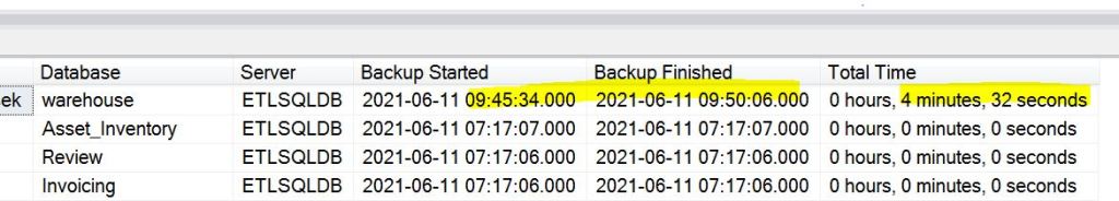 After the backup is complete, we can query the database and verify that the backup took 4.5 minutes which our queries above showed