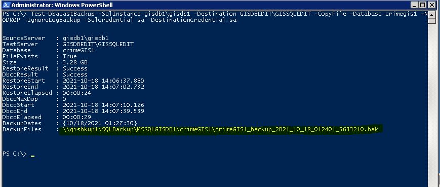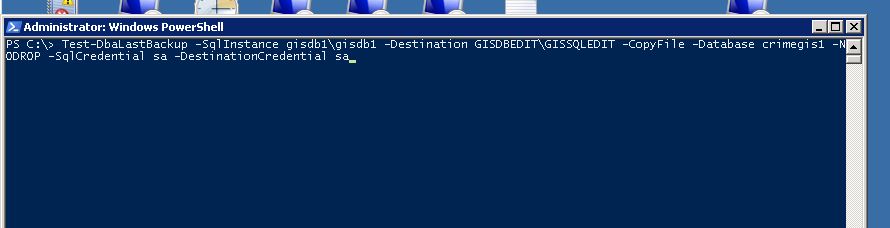 Test-DbaLastBackup -SqlInstance gisdb1\gisdb1 -Destination GISDBEDIT\GISSQLEDIT -CopyFile -Database crimegis1 -NODROP -IgnoreLogBackup -SqlCredential sa -DestinationCredential sa