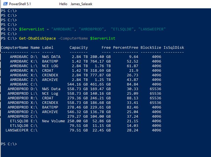 Now we run the Get-DbaDiskSpace command again and pass in $ServerList for the computername.