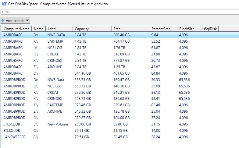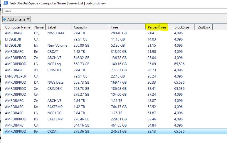 Can we sort this list somehow so we see servers with low disk space at the top? Yes! Just add the | out-gridview at the end of the statement.
