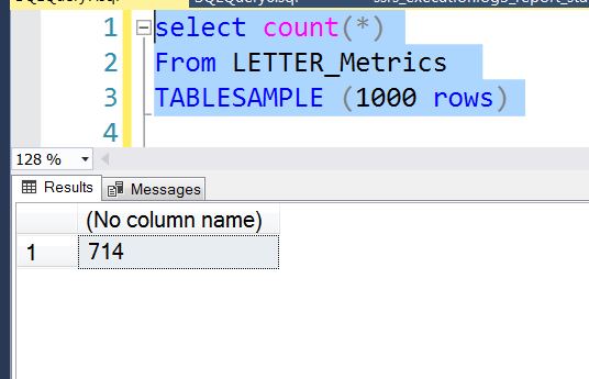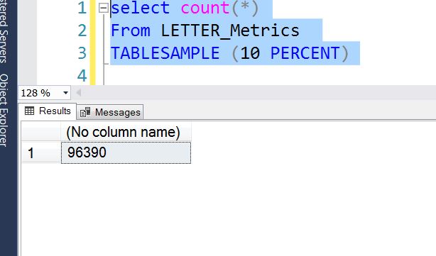 Here is another query, where I am just counting the number of rows while asking for 10% of the rows. However, don’t let the “percent” fool you. That percentage