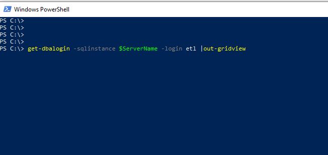 get-dbalogin -sqlinstance $ServerName -login etl |out-gridview