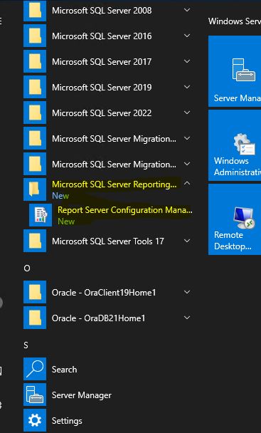 When the server is back up, click the Start button and you will have a new entry for Microsoft SQL Server Reporting Services. Open up the Report Server Configuration Manager.